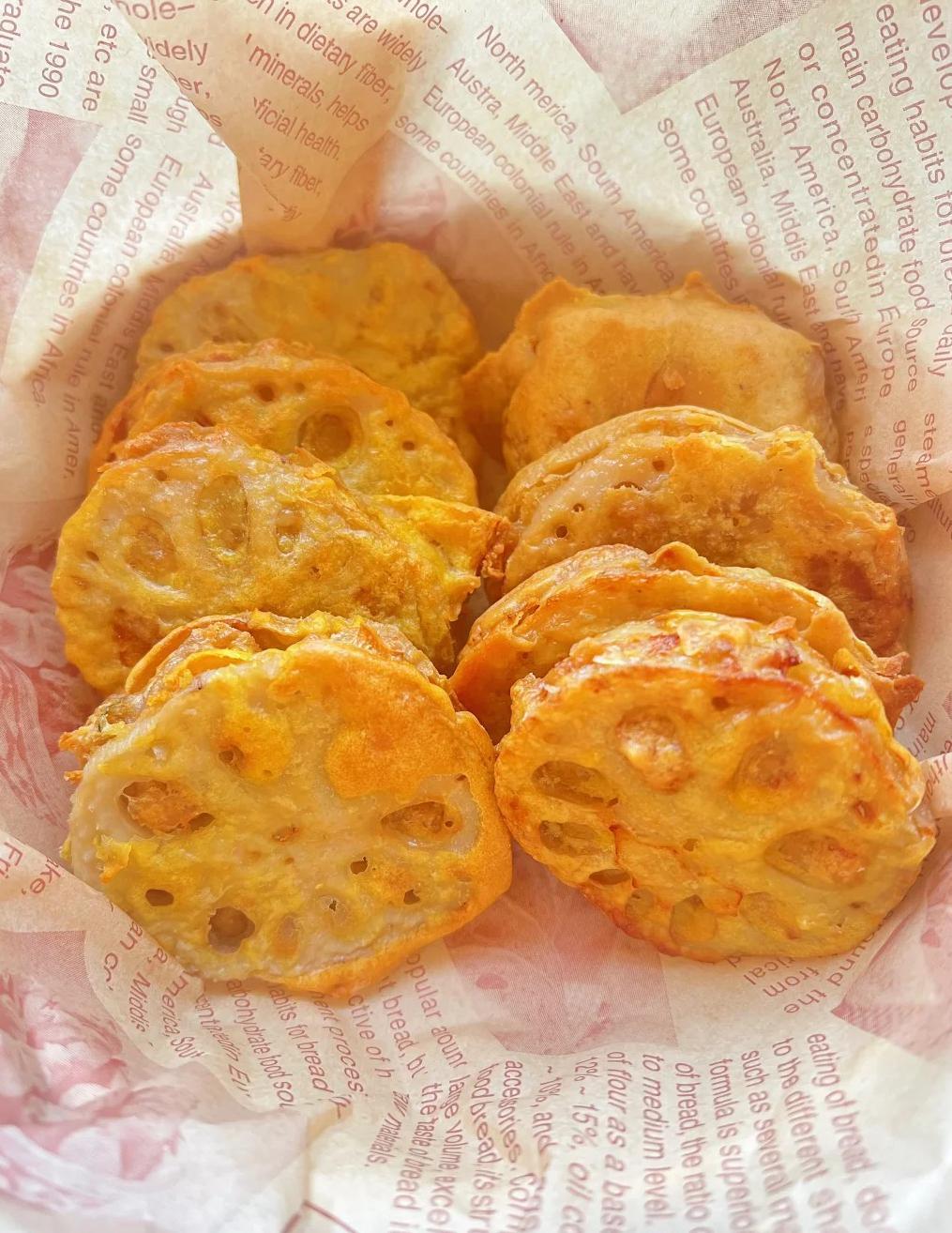 夹了肉馅的藕合,外酥里嫩,有荤有素,是极好的下酒菜和小食。